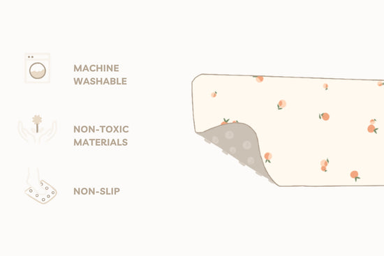 Minimalist peaches that bring a touch of freshness... This rug offers your child a large, safe space with a non-slip surface. And it is easy to wash in the machine at 30°C!