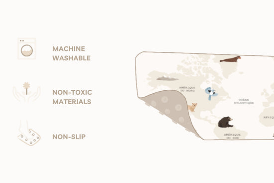 The mat is machine washable at 30°C, rolled with the print on the inside and the suction cups facing outwards. It can also be simply rinsed after each bath and dried using the provided hooks to hang it up.