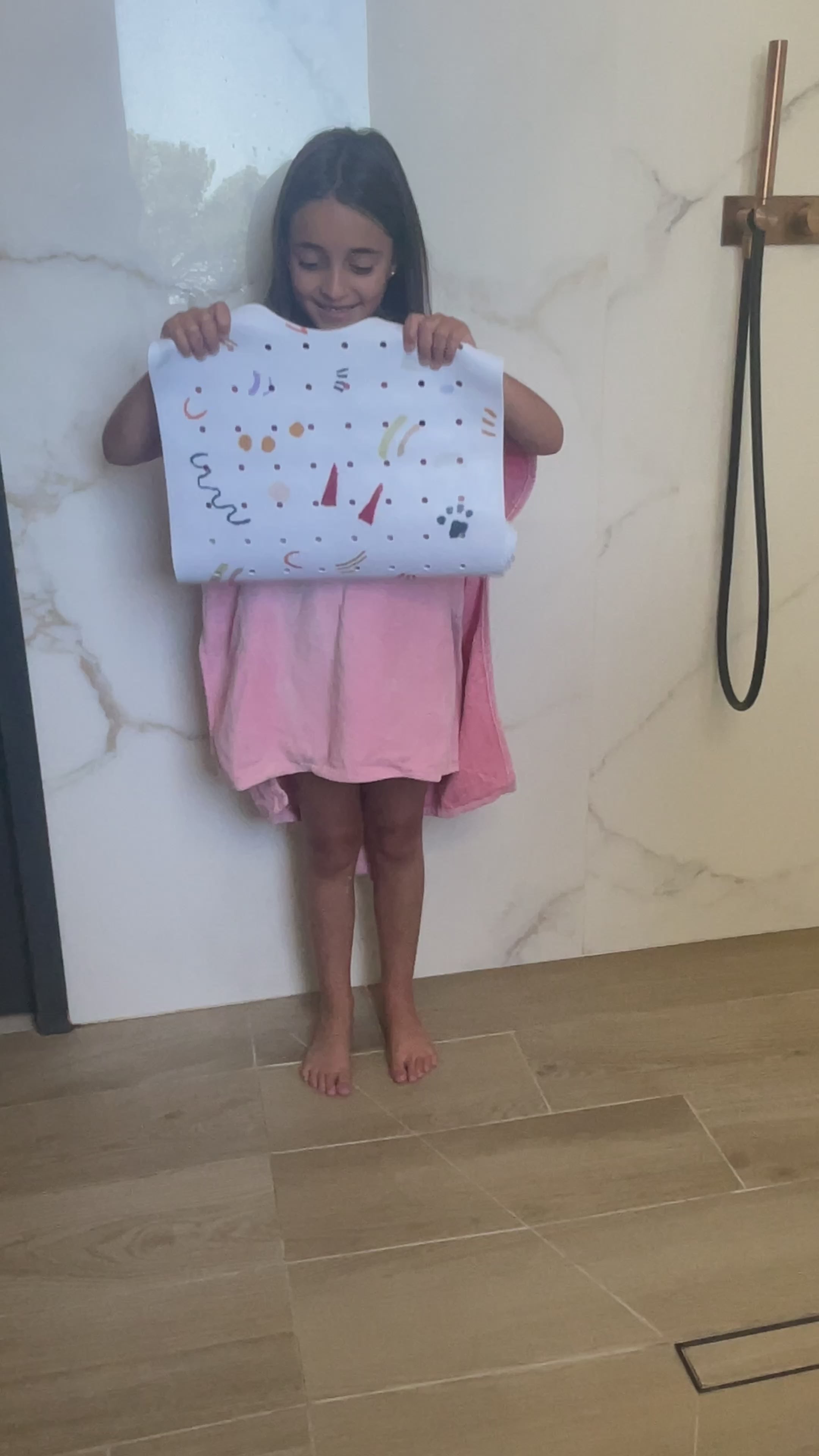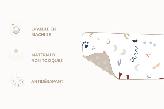 Le tapis est lavable en machine à 30°C, enroulé avec l’imprimé à l’intérieur et les ventouses vers l’extérieur. Il peut aussi se rincer simplement après chaque bain et sécher à l'aide des crochets fournis pour le suspendre.